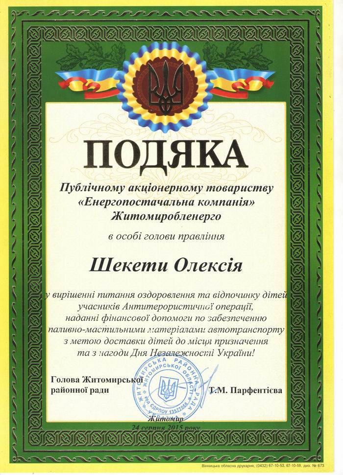 Під час урочистостей одного з цих заходів, якій проводили Житомирська районна держадміністрація і Житомирська районна рада, голова райради Тетяна Парфентієва вручила директору Зарічанського РЕМ Олександру Бращенку Подяку ПАТ «ЕК «Житомиробленерго» в особі Голови Правління Олексія Шекети за допомогу у вирішенні питання оздоровлення та відпочинку дітей учасників АТО, а саме за забезпечення паливно-мастильними матеріалами з метою доставки дітей до місця призначення.