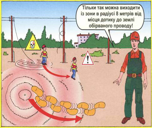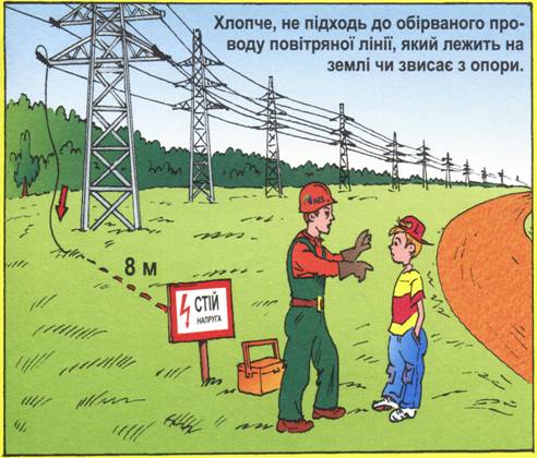 2. Необхідно знати, що смертельно небезпечно не лише доторкатись, але й підходити ближче ніж на 8 метрів до обірваного проводу, який лежить на землі, на гіллях дерев або звисає з опори.