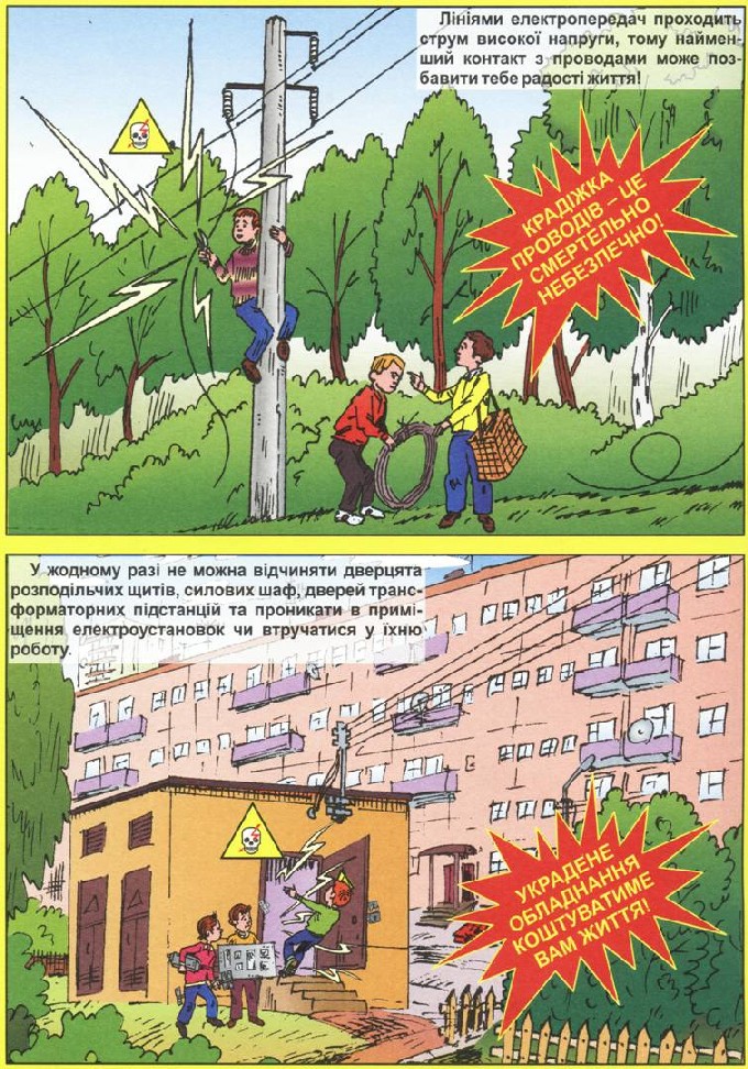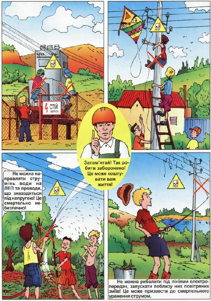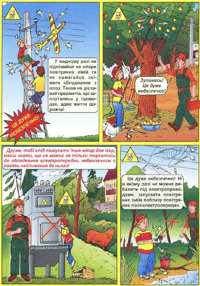 Категорично забороняється підніматися на опори ліній електропередачі, самостійно приєднувати до електромережі будь-які електричні пристрої, відкривати двері трансформаторних підстанцій, виконувати переключення електричних апаратів та проводити будь-які ремонтні роботи.