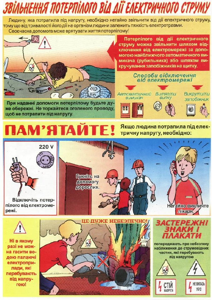 Після усунення дії електричного струму, потерпілому слід надати першу допомогу, попередньо викликавши „швидку допомогу”, а також повідомити про випадок черговому диспетчеру району електромереж (телефон диспетчера є на дверях електроустановки, або ж його знають диспетчери служб 101, 102, 103, 109).