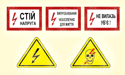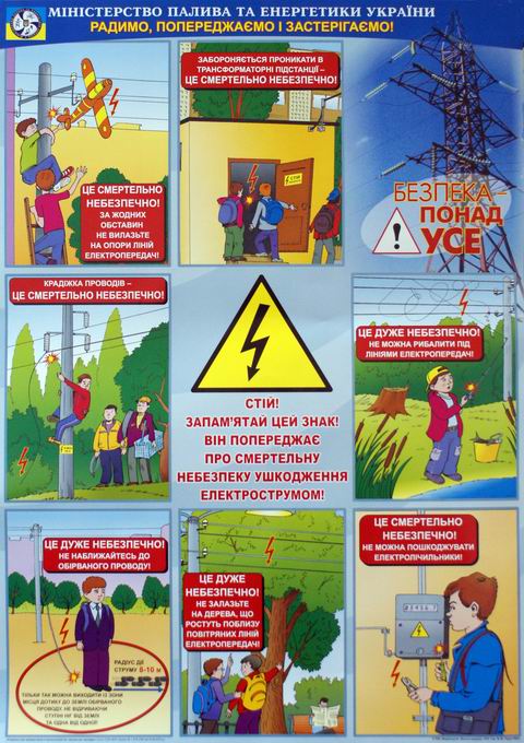 На всіх енергетичних об’єктах є застережні знаки і плакати, які обов’язково встановлюються на огородженнях, на дверях приміщень електроустановок та в місцях підвищеної небезпеки щодо ураження електричним струмом. Запам’ятайте ці знаки!