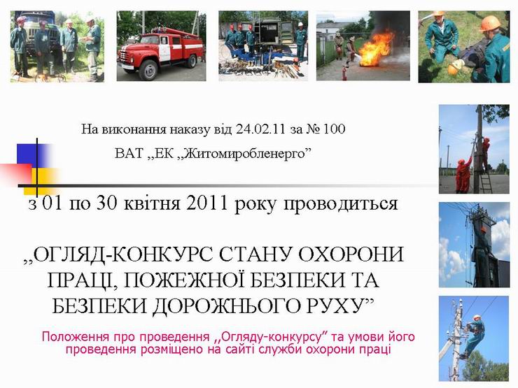 Для залучення всіх працівників Компанії до вирішення питань зі створення належних, безпечних і здорових умов праці, профілактики виробничого травматизму, пожеж та дорожньо-транспортних пригод, виявлення недоліків в організації роботи з охорони праці та їх усунення на всіх ділянках виробництва, посилення пропаганди передового досвіду в області охорони праці, пожежної безпеки та безпеки дорожнього руху та з нагоди відзначення 28 квітня - Всесвітнього Дня охорони праці у „Житомиробленерго” в період з 1 по 30 квітня 2011 року проводиться огляд-конкурс стану охорони праці, пожежної безпеки та безпеки дорожнього руху згідно затвердженого Положення.