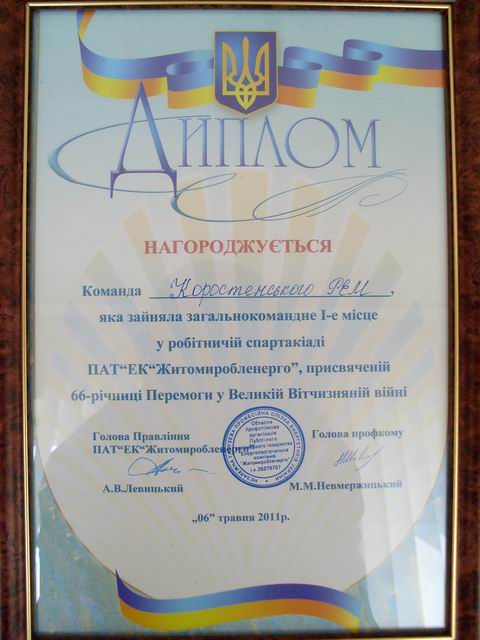 В квітні місяці 2011 року відповідно до затвердженого положення на базі Коростенського РЕМ проходили змагання шостої Робітничої спартакіади ПАТ „ЕК”Житомиробленерго”, приуроченої до свята Перемоги з восьми видів спорту (волейбол, міні-футбол, гирьовий спорт, настільний теніс, шахи, більярд, нарди, перетягування канату). У змаганнях цього року приймала участь рекордна кількість спортсменів – більше п’ятисот чоловік, що свідчить про неабияку популяризацію фізичної культури та спорту серед робітників та службовців Обленерго.