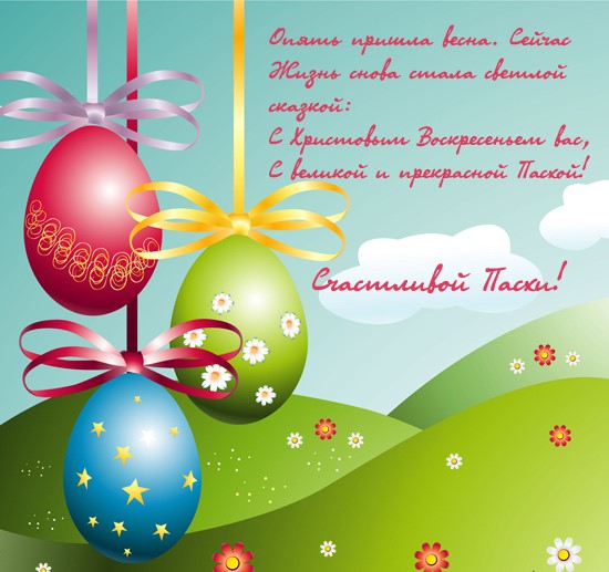 Нехай Ваші душі будуть багаті на добро, як святковий стіл, чисті як Великодній рушник і веселі, як українські писанки. Хай малинові дзвони Великодня принесуть у Вашу оселю радість, віру, надію і любов.