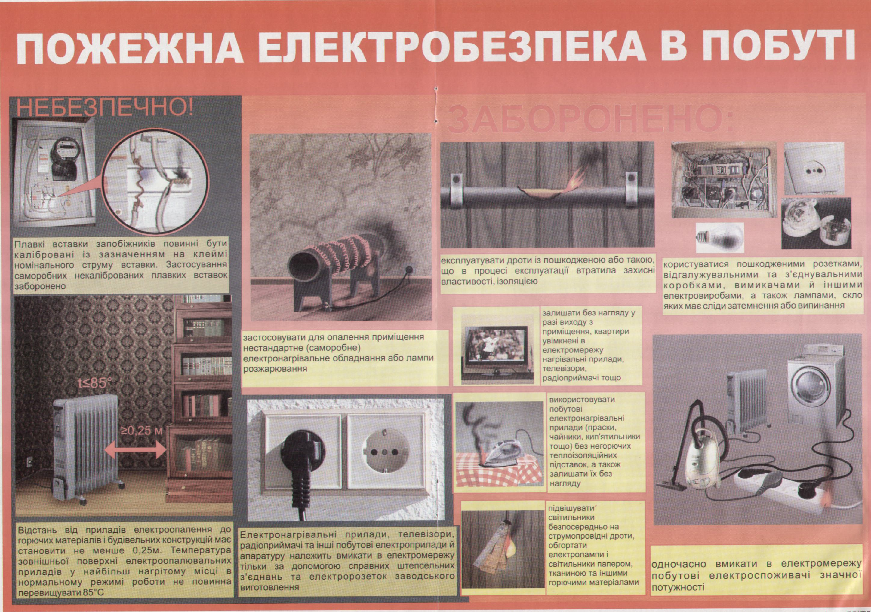 Для запобігання виникнення пожеж по причині порушення правил монтажу та експлуатації електрообладнання, побутових електроприладів ЗАБОРОНЯЄТЬСЯ: