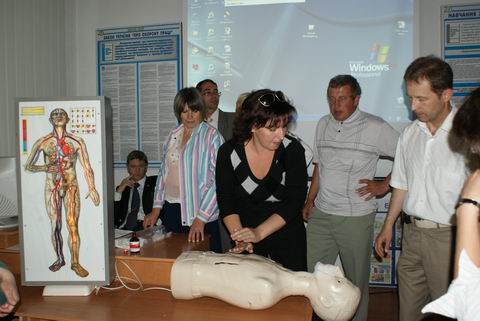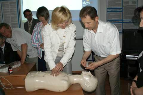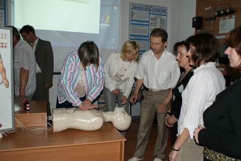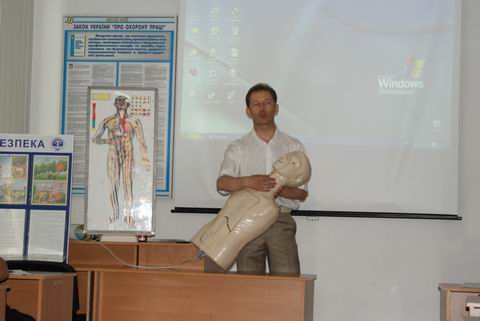 Заступник начальника служби охорони праці Володимир Фоменко провів практичне заняття з педагогами щодо надання першої медичної долікарської допомоги людині при ураженні електричним струмом і кожен присутній міг самостійно відпрацювати навики реанімації на сучасному тренажері-манекені.