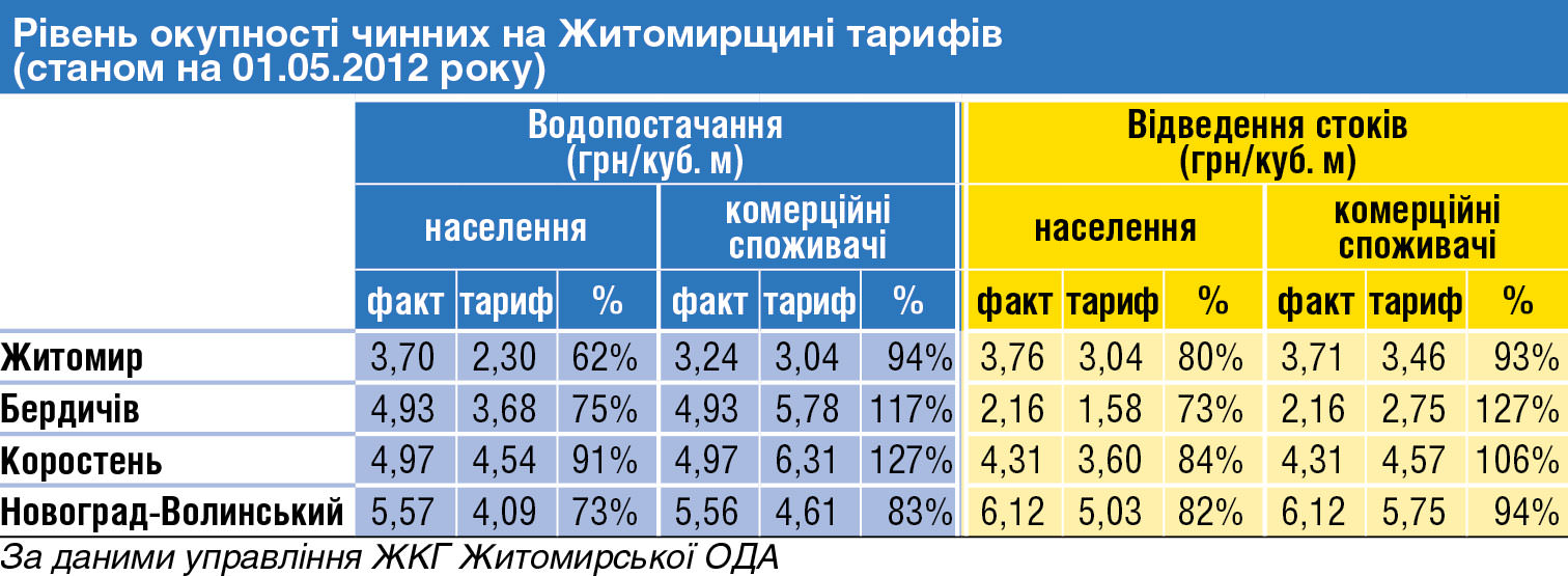 Якщо в решті великих міст області, де тарифи для абонентів — фізичних осіб теж не відповідають економічно об∂рунтованому рівню, тягар фінансування водоканалів хоча б частково перекладено на підприємства і установи, для яких послуги на 17—27% дорожчі від собівартості, то у Житомирі все з точністю до навпаки: саме місцевий водоканал до?тує… бізнес. За підрахунками фахівців, лише торік це вилилось (у прямому і переносному значенні слова) у понад 2 млн грн, зекономлених підприємницькими структурами на «благодійництві» комунального підприємства, яке при цьому вимушене жити… у борг.