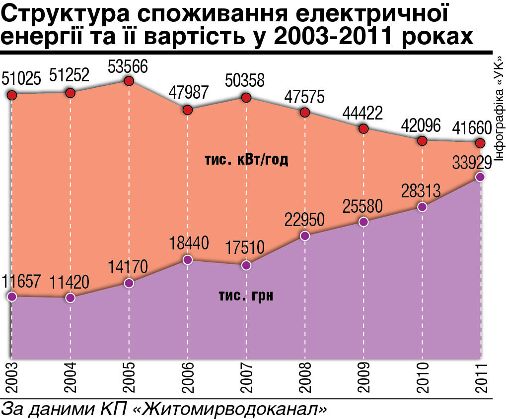 — Середньомісячна вартість спожитої в області електроенергії становить близько 110 млн грн, а Житомирський водоканал заборгував нам уже понад 30 млн грн, — розповідає комерційний директор підприємства Сергій Невмержицький. — Як наслідок, для своєчасної оплати замовлених обсягів електроенергії доводиться відволікати власні обігові кошти і навіть залучати короткотермінові банківські кредити. Неможливо спокійно миритися з існуванням боргу, який щомісяця лише зростає на 1,5—2 млн грн. Тим більше, що частка Житомирського водоканалу в структурі загальнообласного боргу за електроенергію вже сягнула 45%!
