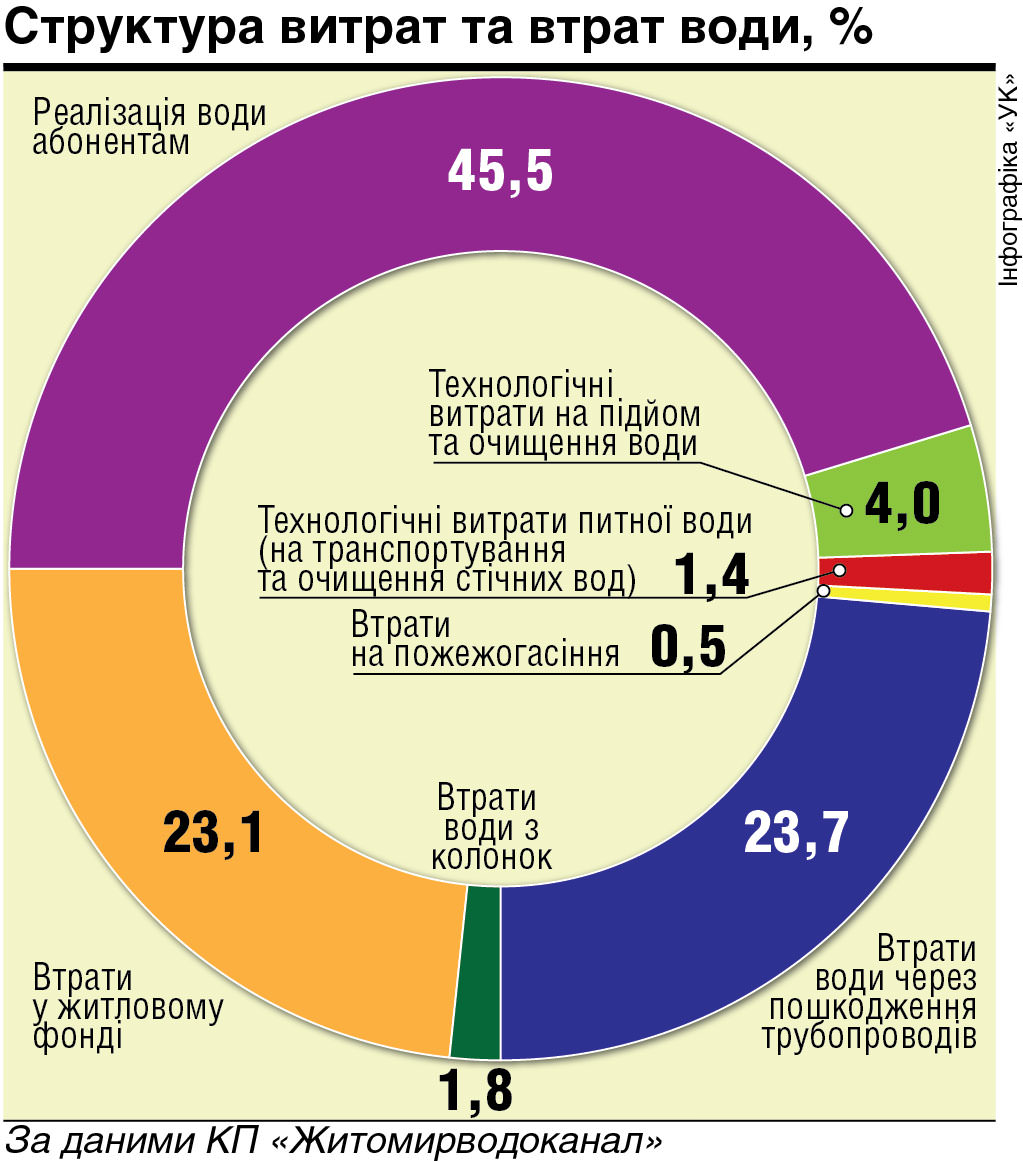 Однак навіть з урахуванням цього лише 45,5% води, доведеної до кондицій питної, потрапляє до абонентів, а решта фактично марнується. Зокрема, 23,7% втрат припадає на діряві водопровідні мережі, половина з яких у Житомирі належать до категорії ветхих і аварійних. Ще 23,1% втрат — «вклад» внутрішньобудинкових мереж, що обслуговуються ЖЕКами, житлово-будівельними кооперативами і ОСББ. Зрозуміло, що всі «планові» виливи закладаються до вартості води, яку ми оплачуємо. Здавалось би, досить замінити проржавілі труби — і навіть нинішні тарифи з лихвою перекриють всі фактичні витрати з водопостачання. Однак біда в тому, що коштів, потрібних для всенагального оновлення мереж, у комунальників немає, тимчасом як виділені з бюджету фінансові ресурси спрямовуються навіть не на «латання дірок», а на штучне підтримання «дешевих» тарифів, що на ділі задорогі як для держави, так і для кожного з нас…