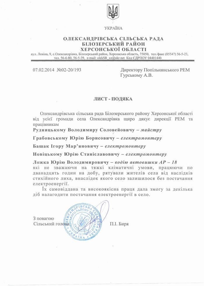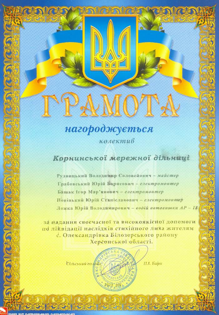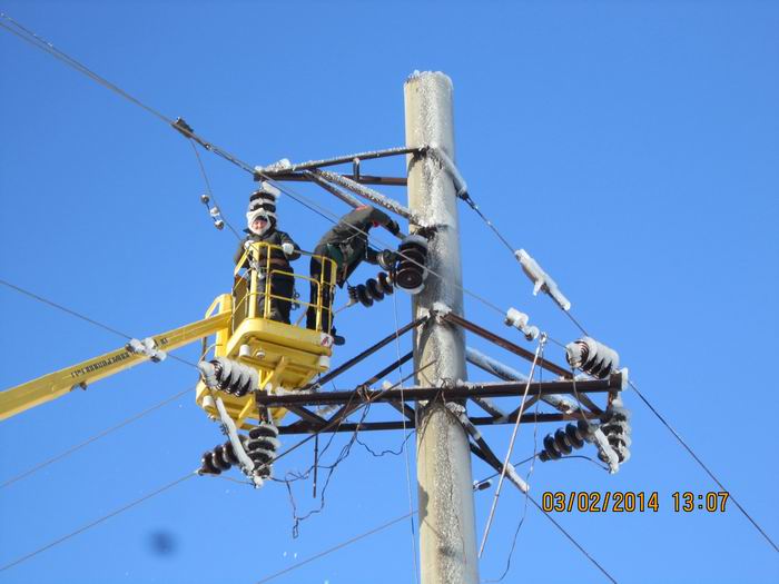 В період з 02.02. по 08.02.14 р. для надання допомоги в ліквідації пошкоджень 0,4-10 кВ в електромережах ПАТ «ЕК» Херсонобленерго» після обледеніння була направлена бригада Корнинської мережної дільниці Попільнянського РЕМ.