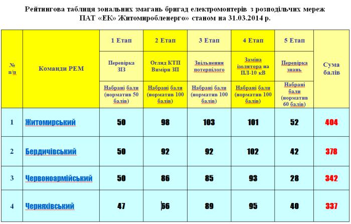 Кращими на цих змаганнях виявились працівники Житомирського РЕМ, які зайняли перше місце із загальною кількістю 404 бали.
