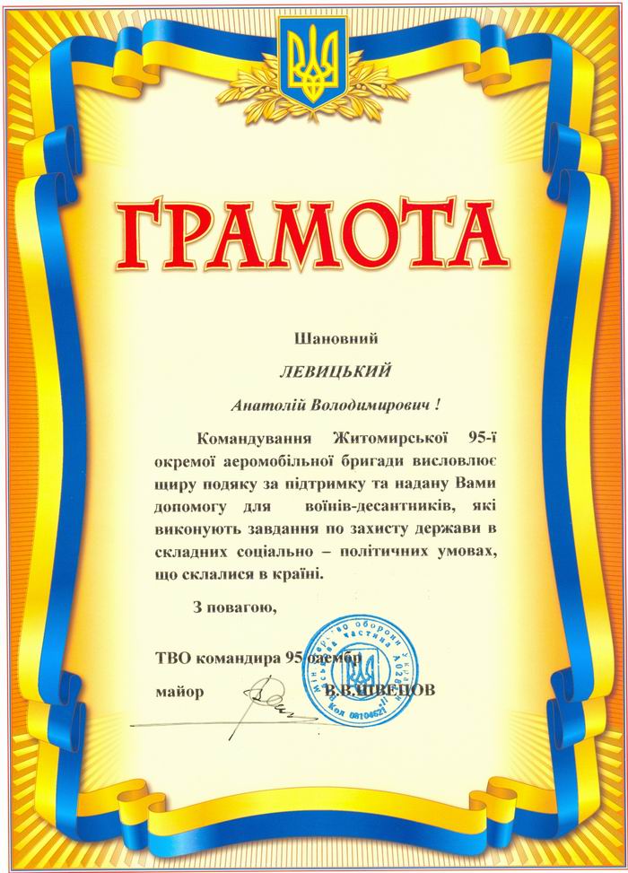 Військовослужбовці 95-ї окремої аеромобільної бригади в лиці виконуючого обов'язки командира бригади майора Швецова Володимира Володимировича висловили подяку та запевнили, що захищають Батьківщину з честю і роблять все можливе для того, щоб зберегти мир і спокій в нашій державі.