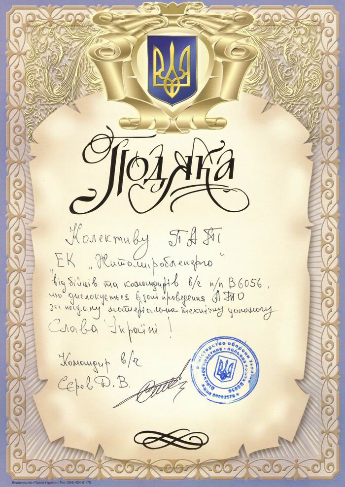Взагалі товариством «Житомиробленерго» було закуплено й передано військовим частинам речей й технічних засобів на загальну суму майже 811 тис.грн.