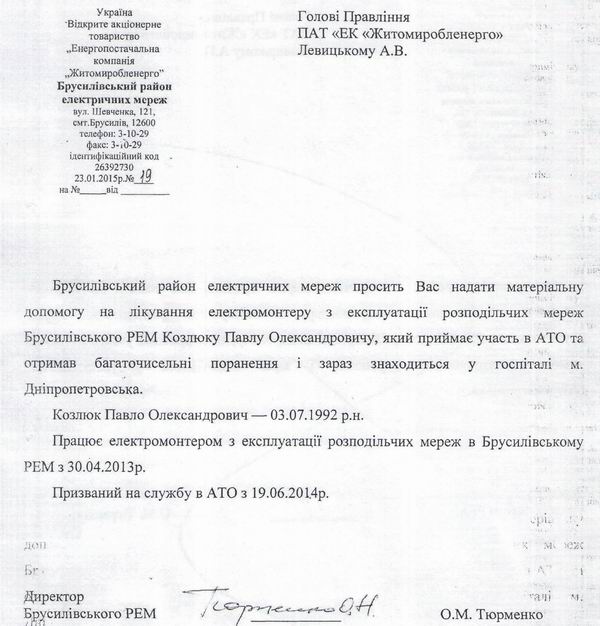 ПАТ «ЕК «Житомироблененрго» оголошує збір коштів для надання допомоги електромонтеру з експлуатації розподільчих мереж Брусилівського РЕМ Козлюку Павлу Олександровичу, 1992р.н., який приймає участь в АТО та отримав численні поранення. Зараз він перебуває у госпіталі міста Дніпропетровська . Козлюк П.О. працює електромонтером з 30.04.13р.