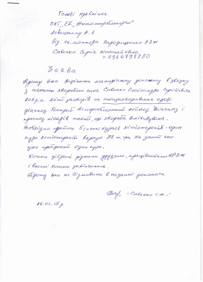 ПАТ «ЕК «Житомиробленерго» оголошує акцію по збору коштів на лікування Савенка Олександра. Зібрані кошти прохання надавати помічнику Голови Правління Камерон Л.С. (т.40-20-12) або директору Народицького РЕМ Вигівському О.А. для подальшої їх передачі батькам Савенка Олександра Сергійовича на лікування.