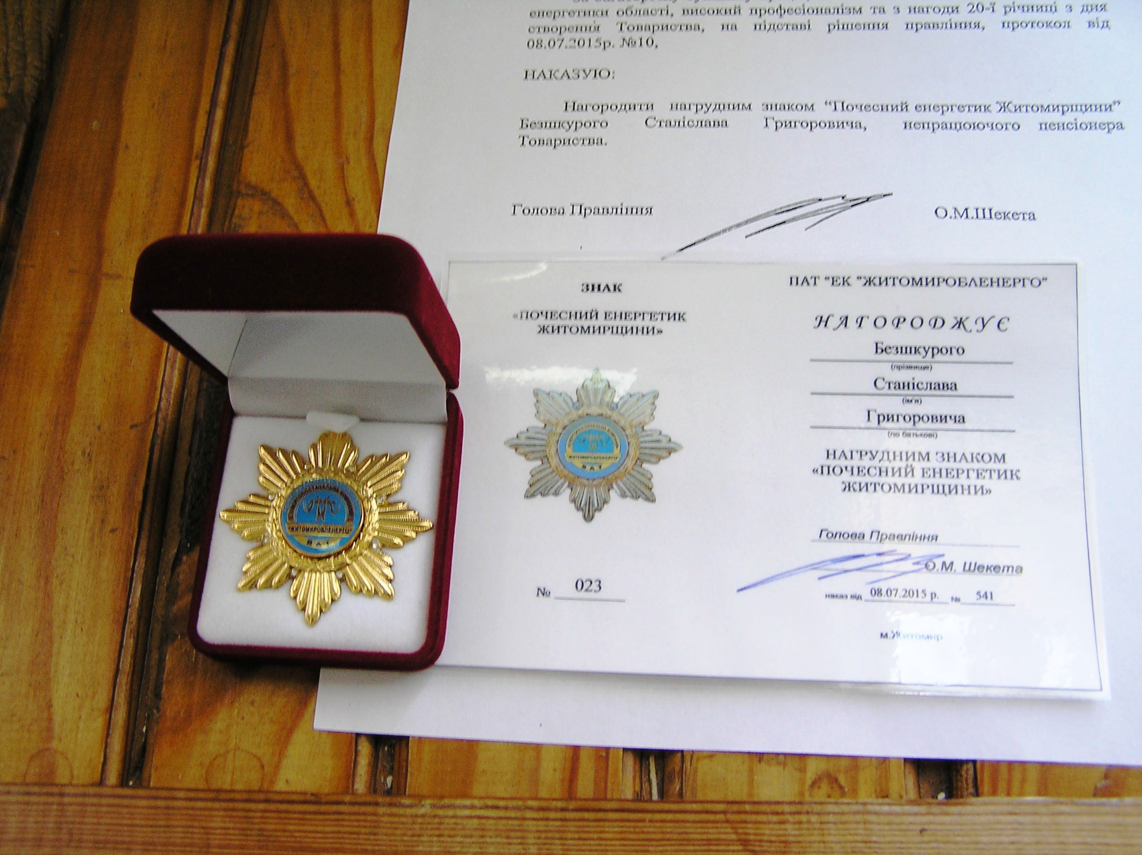 За багаторічну сумлінну працю, значний особистий внесок у розвиток енергетики області, високий професіоналізм та з нагоди 20 річниці з дня створення Товариства Олексій Шекета вручив Станіславу Безшкурому медаль «Почесний енергетик Житомирщини».