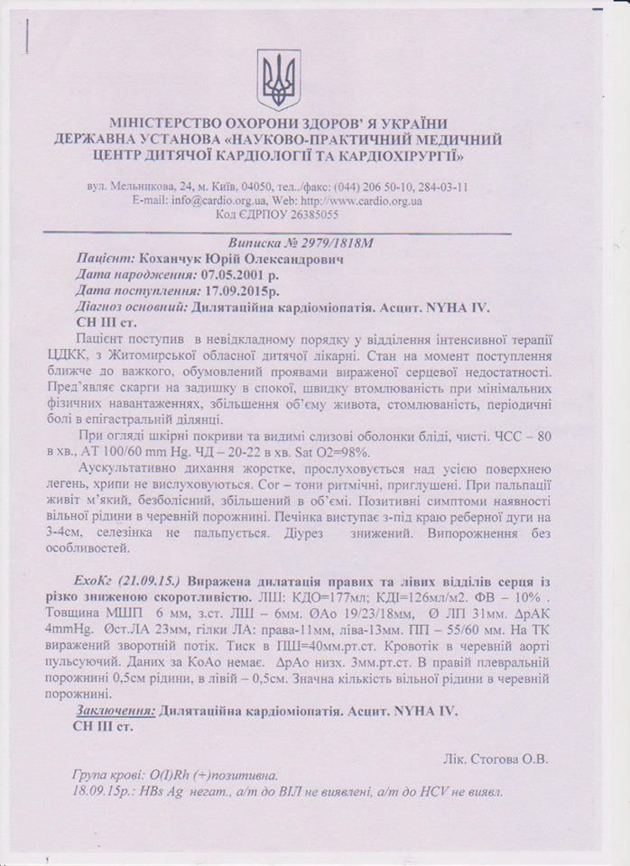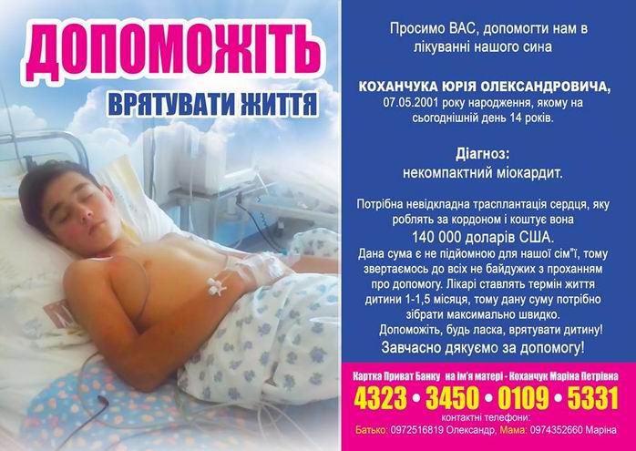 Місто Житомир сколихнула останніми днями звістка - 14-річному хлопчику потрібна термінова пересадка серця. Ця звістка обєднала навколо себе багато людей, які долучилися до допомоги Коханчуку Юрію. Щоденно надходять кошти, але їх ,на жаль, не вистачає. Хлопчик був абсолютно здоровий, але наразі його життя залежить від величезної суми, яку мають сплатити його батьки за операцію. В Україні таких операцій не проводять. Операція коштує 140 тис.доларів. Відповідно до звітів батьків - наразі зібрано майже пів мільйона гривень.