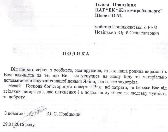 Колектив ПАТ «ЕК»Житомиробленерго» чуйно відгукнувся на біль, тим більше, що то біль дитячого серця. Аби підтримати родину колеги, майстра Попільнянського РЕМ, працівниками підприємства було організовано збір коштів. До акції долучилися і працівники «ВС Енерджі Інтернейшнл Україна». За попередніми підсумками зібрано більше 26 тис.грн. Родина Новіцьких не відкрила благодійний рахунок і наразі вирішила обмежитися тим, що зібрали колеги. Батьки Яніни дуже вдячні за підтримку, а колектив «Житомиробленерго» бажає цілковитого одруження маленькій Яніні та Божого благословення цій сім’ї. Як повідомлялося раніше, дитина майстра Попільнянського РЕМ Новіцького Ю.С. терміново потребує вартісного лікування – маленька Яніна,2012 р.н., наразі проходить лікування в Житомиирській дитячій обласній лікарні в онкологічному відділенні, лікарі встановили діагноз- гострий лімфообластний лейкоз. |